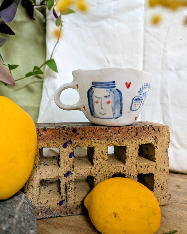 Tasse en porcelaine, modelée et illustrée à la main.